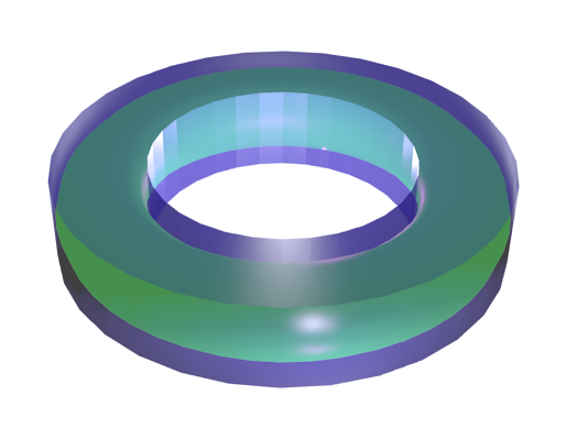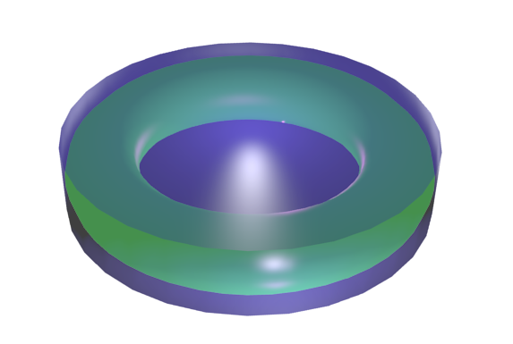 A torus is the famous shape of a tube that loops on itself, which can be parameterized as a circle of radius \(r\) (called the inner radius) that is extruded along another circle of radius \(R\) (called the outer radius). It looks as follows, except that the loop is complete.