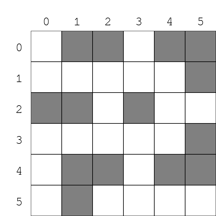 We will represent square grid mazes in Python by \(n \times n\) matrices with 1s and 0s indicating whether a cell is free or blocked respectively. For example, the \(6 \times 6\) maze above will be encoded like so: