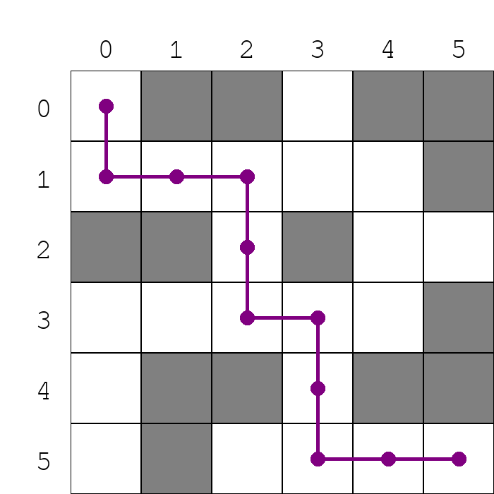 purple_path = [(0,0), (1,0), (1,1), (1,2), (2,2), (3,2), (3,3), (4,3), (5,3), (5,4), (5,5)]In general, we say that a list of coordinates \(p = [(r_1,c_1),\dots,(r_n,c_n)]\) constitutes a path in a maze \(M\) just in case it satisfies four conditions:
