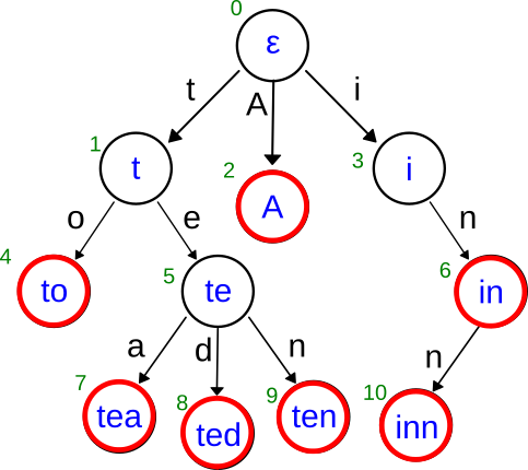 In Volume 4B of The Art of Computer Programming, Donald Knuth suggests a procedure for constructing \(m \times n\) word rectangles using backtracking combined with a trie data structure. A trie is a kind of dictionary that supports \(O(k)\) worst-case search and insertion time for any given string of length \(k\) (in particular, the time does not depend on the number of strings in the dictionary). The key property of tries that make them useful for backtracking is that they permit efficiently testing whether a string is a valid prefix of a collection of strings, and of finding out what are its possible suffixes. Before discussing the backtracking algorithm itself, let us take a moment to describe tries in more detail, beginning with how to visualize them.