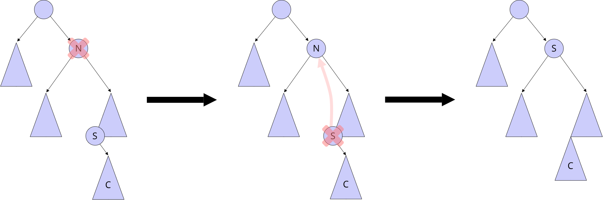 \(N\) has two children: In that case, we do not remove \(N\), but instead we replace its value with the value of its in-order successor \(S\) (= the left-most node of the right-subtree of \(N\)). Then, we remove \(S\): since \(S\) has at most one child, we are back in one of the two previous cases.