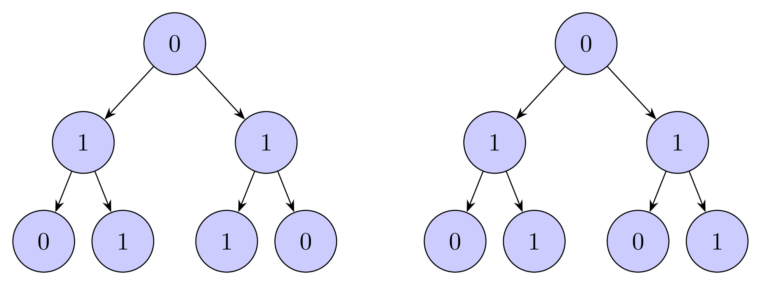 check_symmetry(root)that returnsTrueif the tree is symmetric in the sense that it is its own mirror image, andFalseotherwise.For example, of the following two trees, the one on the left is symmetric, but the one on the right is not: